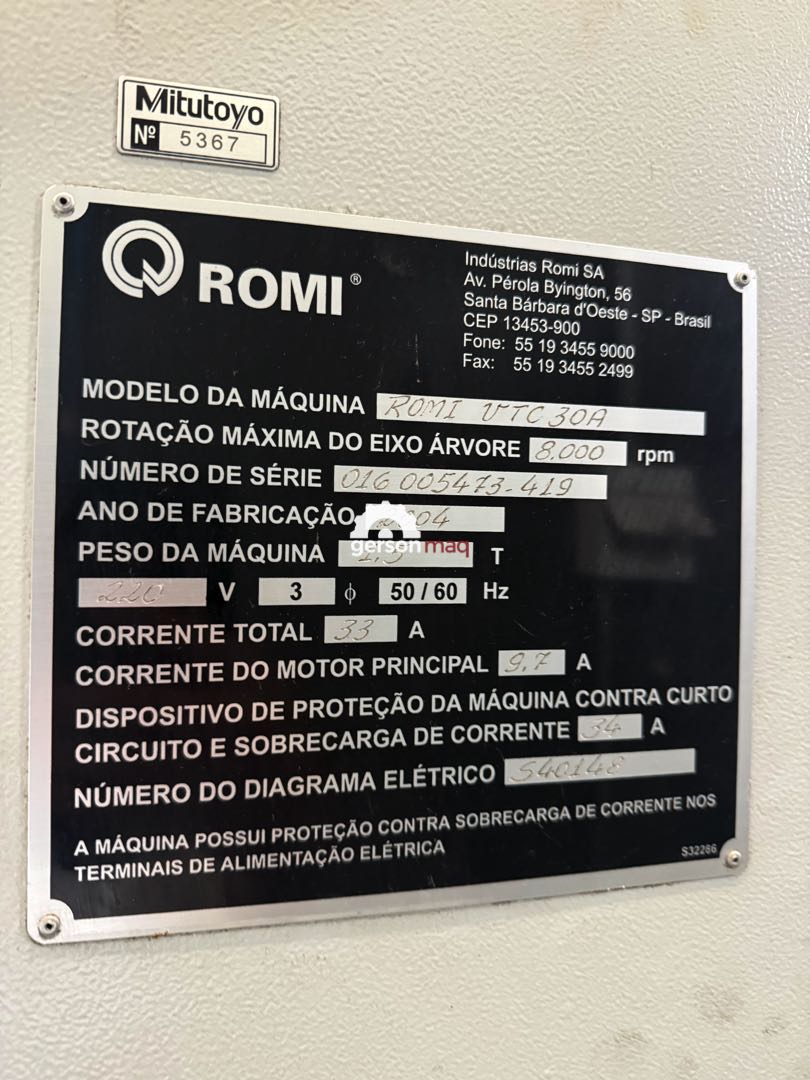 Centro de usinagem Romi VTC30A 2004 à venda, equipado com comando Fanuc 21i-MB, ideal para empresas que buscam máquina CNC compacta, precisa e com excelente desempenho para produção leve e média.