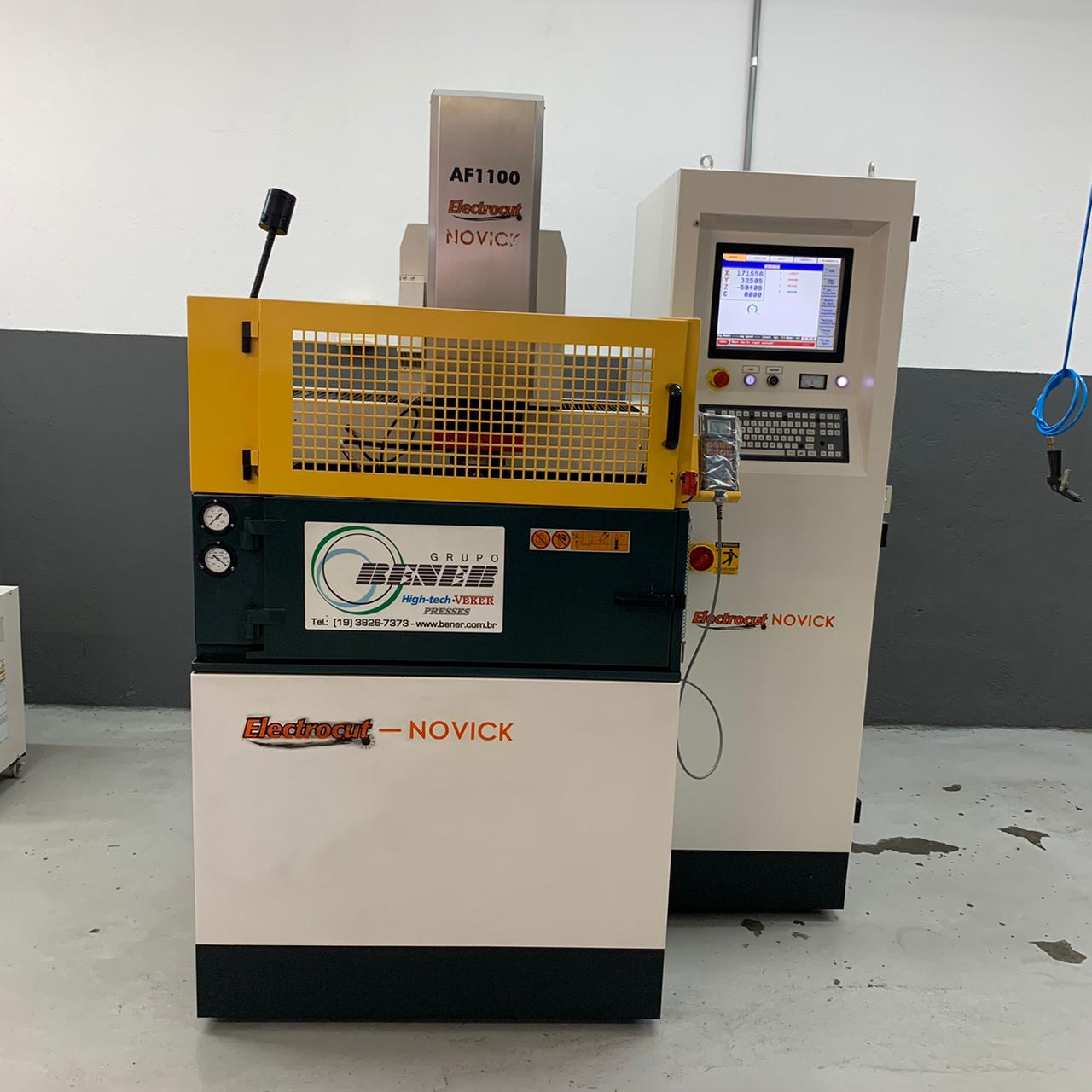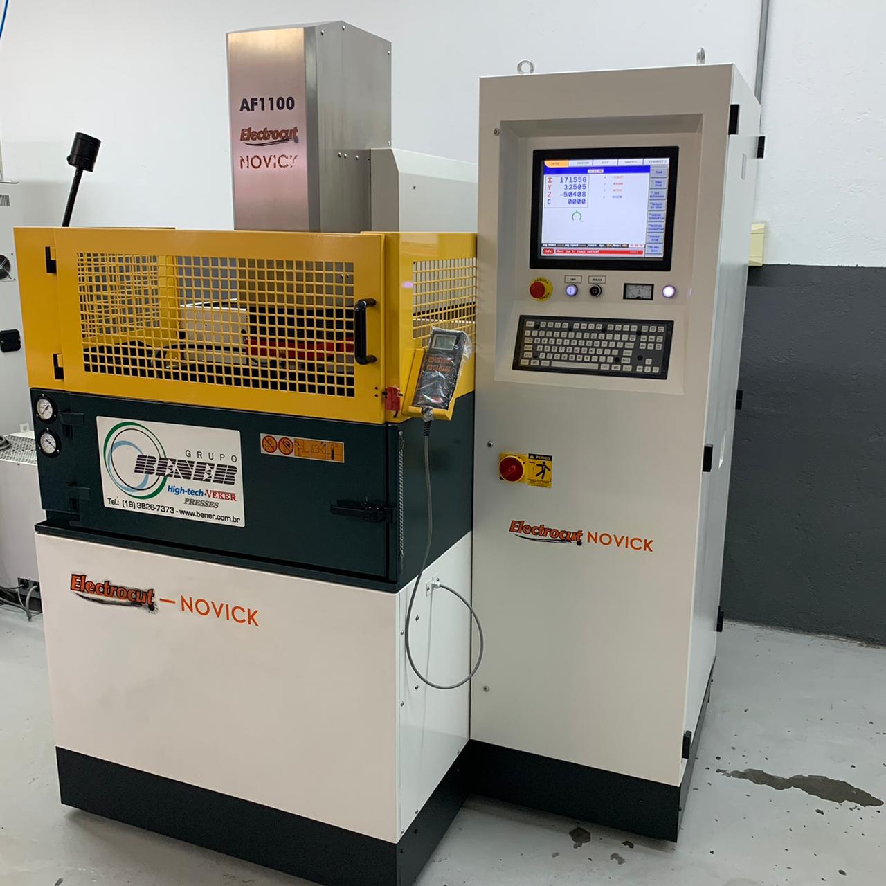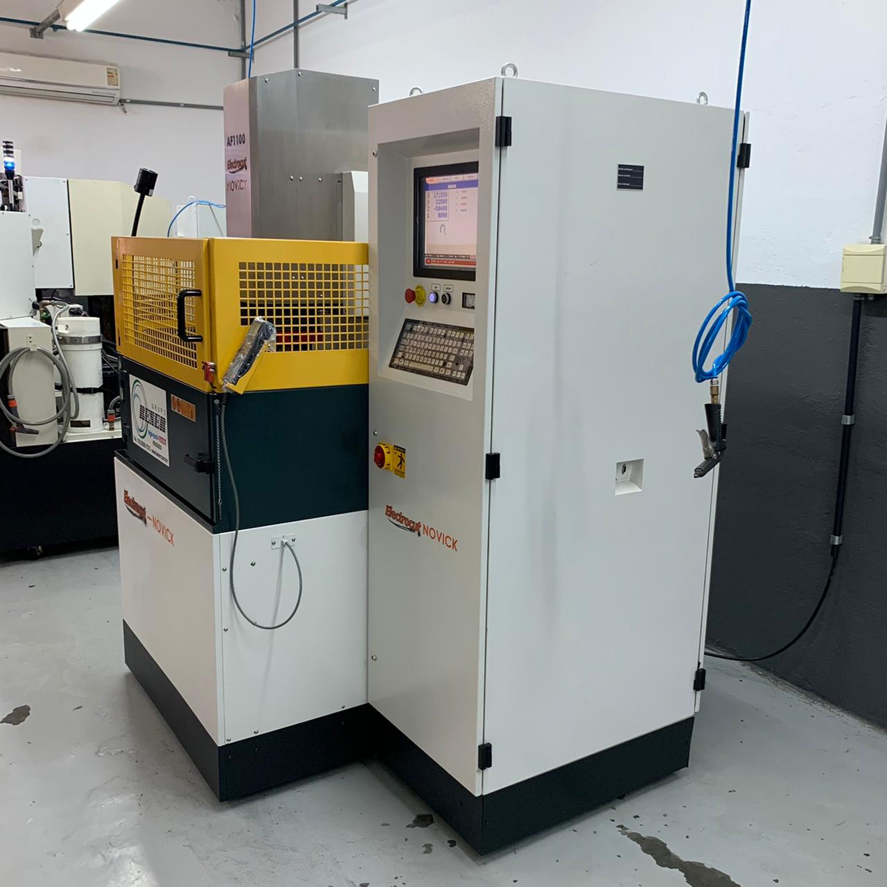 Equipado com CNC, da marca Electrocut/Novick. De fácil operação, a máquina conta com monitor LCD 15?, 4 eixos programáveis simultaneamente e 5 Funções: setup, erosão, edição, gráficos e diagnósticos. O CNC permite ainda controlar 4 tipos de órbita (circular, quadrada, vetorial e poligonal) em 2 modos (órbita livre e servocontrolada) e controle remoto completo para operação a curta distância. CNC traz inúmeras vantagens ao processo de eletroerosão, com destaque para o fato de permitir que todas as funções sejam programáveis, automatizando o processo, deixando de depender apenas do talento do operador. A máquina se ajusta aos parâmetros de usinagem, incluindo as variáveis como tipo de eletrodo e de material de trabalho, assim como aos tipos de operação: desbaste, acabamento fino etc. A AF é equipada com mesa fixa de 600x400 mm e tanque de 1050x620x380 mm. A movimentação dos eixos Y/Z é feita por guias lineares de precisão a 250 mm, enquanto o eixo X trabalha a 380 mm.