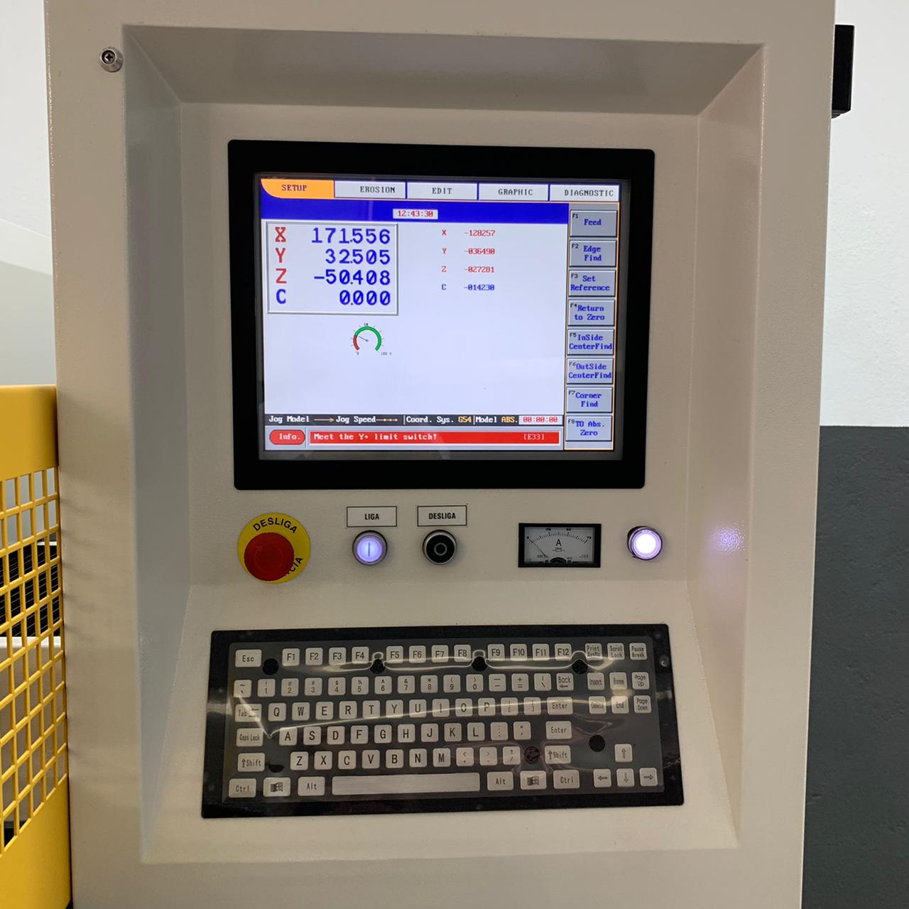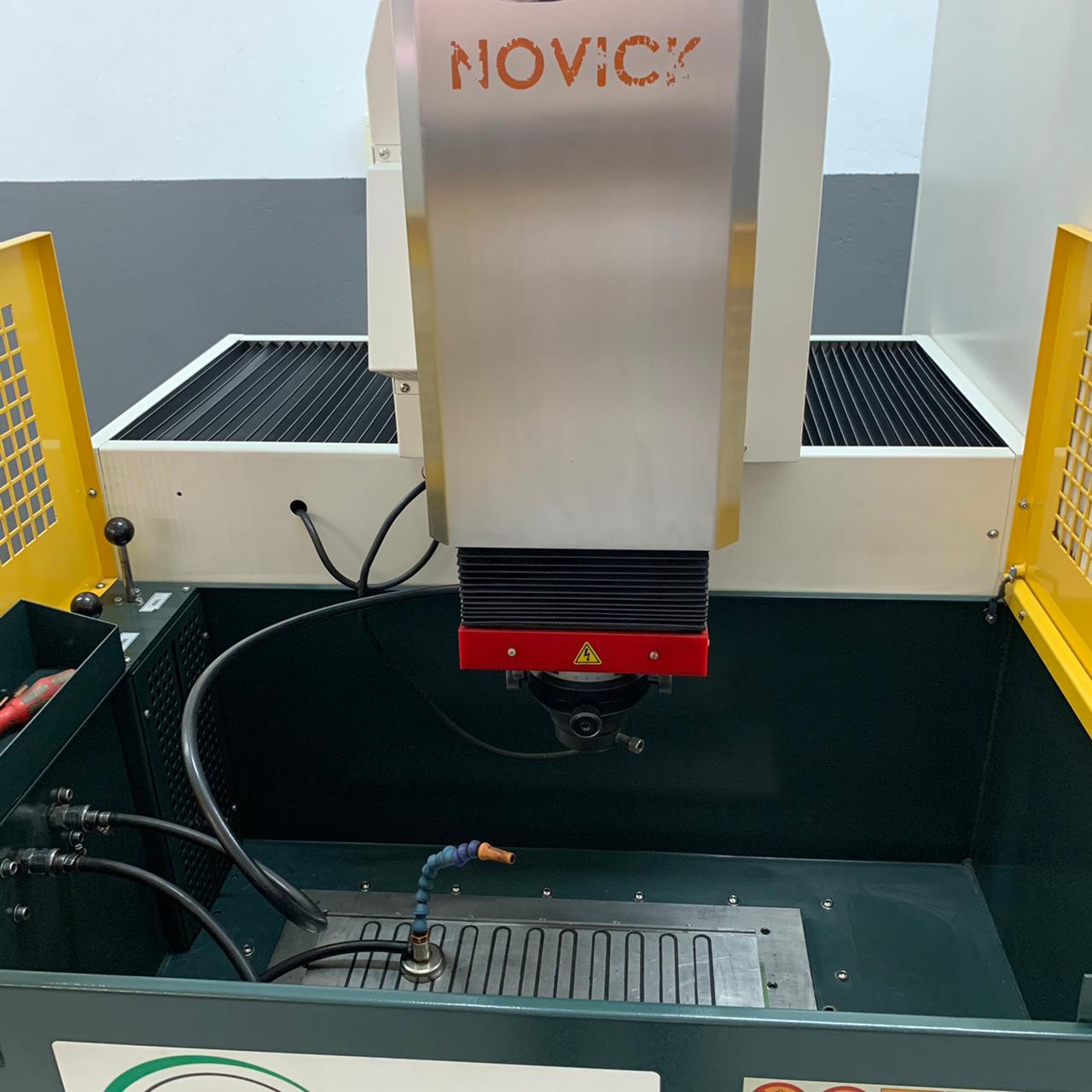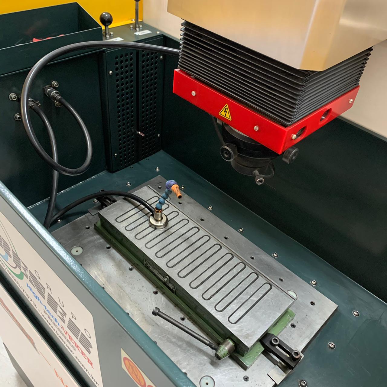 Equipado com CNC, da marca Electrocut/Novick. De fácil operação, a máquina conta com monitor LCD 15?, 4 eixos programáveis simultaneamente e 5 Funções: setup, erosão, edição, gráficos e diagnósticos. O CNC permite ainda controlar 4 tipos de órbita (circular, quadrada, vetorial e poligonal) em 2 modos (órbita livre e servocontrolada) e controle remoto completo para operação a curta distância. CNC traz inúmeras vantagens ao processo de eletroerosão, com destaque para o fato de permitir que todas as funções sejam programáveis, automatizando o processo, deixando de depender apenas do talento do operador. A máquina se ajusta aos parâmetros de usinagem, incluindo as variáveis como tipo de eletrodo e de material de trabalho, assim como aos tipos de operação: desbaste, acabamento fino etc. A AF é equipada com mesa fixa de 600x400 mm e tanque de 1050x620x380 mm. A movimentação dos eixos Y/Z é feita por guias lineares de precisão a 250 mm, enquanto o eixo X trabalha a 380 mm.